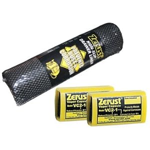 Product Description : From the ManufacturerAnti-Rust/Corrosion Drawer Liner and 2 - Vapor Capsules - protect tools and hardware against rust and corrosion for up to 5 years (vapor capsule - up to 1 year). The non-slip drawer liners and vapor capsules create an invisible FDA safe vapor shield around aluminum, brass, copper, iron, and steel. The vapor capsules protect all ferrous products within a 2 ft radius. Made by the leader in rust and corrosion protection. Product Description : Rust and Corrosion Protection for: Steel, Iron, Brass, Copper Aluminum, Silver and Nickel Use Zerust No-Rust Non-Slip Drawer Liners to protect household items such as garden tools, toolbox contents, firearms, coin collections, jewelry, and more. Zerust NoRust Vapor Capsule capsule creates an invisible vapor shield around Aluminum, Brass, Copper, Iron, Steel, and Silver from rust. Place Zerust NoRust Vapor Capsule inside tool boxes, utility drawers, tackle boxes, knife drawers, tool cabinets, truck boxes, golf bags, garage cabinets, basement storage locker containers, any enclosure to prevent rust and corrosion. HOW norust by ZERUST? WORKS These drawer liners contain proprietary ZERUST? VCI (Vapor Corrosion Inhibitor) formulations That are designed to protect metal surfaces from surface rust/corrosion while within en enclosure. When a liner is removed from its sealed polyethylene bag and placed in an enclosure, it begins to emit an invisible, odorless, non-toxic vapor, which diffuses throughout Iv surrounding atmosphere until the air is saturated. The ZERUST? rigger molecules will cling to metal surfaces and protect them from rust and corrosion until the metal object being protected is removed from the enclosure. After removal from the ZERUST? environment, the protective molecules dissipate. EASY INSTALLATION AND USE ZERUST? drawer liners are easily and simply installed in a matter of seconds. Simply cut liner to required drawer dimensions. It is important, however, to follow these guidelines: think enclosure. Be sure to minimize the exposure of the enclosed area to the outside atmosphere. This can shorten the life span of the chemical effectiveness of the VCI. norust by ZERUST? SAFETY Drawer liners can be used in any environment without measurable chemical interaction. norust by ZERUST? vapors will not harm wood or wood surfaces. WARRANTY Protects for up to 5 years.