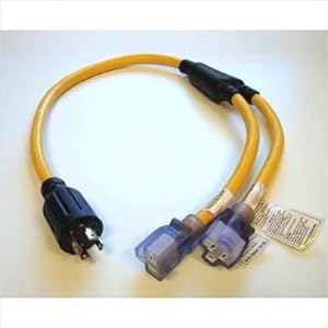 Product Description : RJB10403Y Features: -Allows use of the full power receptacle on your generator.-Plug splits off into two standard NEMA 5 - 20 receptacles.-Power indicator lights. Includes: -Includes L14 - 30 male end, designed for generators up to 7500 Watts. Specifications: -Designed for 5500 - 7500 Watt generators.