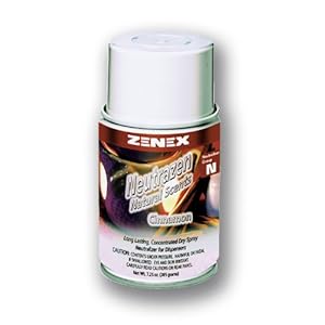 Product Description : Neutralizes Malodors Long Lasting Control Dry Spray, No Fall out Leaves a pleasant scent Non-Staining Non-Chlorinated, No CFC's For use in automatic dispensers. Formula delivers maximum fragrance and odor control with measured releases. Deliciously scented, finely atomized spray carries farther and lasts longer. Non-chlorinated. V.O.C. compliant. Chemically neutralizes malodors. Dry spray particles. Application and Uses For use in locker rooms, hospitals, nursing homes, smoking areas, cars, boats, RVs, motels, restaurants, bathrooms, carpets, upholstery, draperies, and fabrics. Eliminates tobacco smoke, cooking odors, mold, and mildew odors. Directions for Use STANDARD USAGE: Place aerosol dispenser refill in metered dispenser. Controls odors for up to 4,000 cubic feet. Emits pre-measured dosage every 15 minutes for up to 40 days. Each can contains 3,800 metered releases. MANUAL USAGE: Press once to release. Appropriate dosage is instantly dispersed. Repeat if necessary. Scent: Cinnamon Can Size: 10 oz (283 g) Net Weight: 7.25 oz (205 g) /Can Minimum Order: 1 Case (12 Cans) Important Note: Check can label and Material Safety Data Sheet for any additional limitations and warnings. *****WARNING!*****WARNING!*****WARNING!*****WARNING!*****WARNING!*****WARNING! PRODUCT CANNOT SHIP VIA ANY TYPE OF AIR TRANSPORT, INCLUDING UPS NEXT DAY AIR, UPS 2ND DAY AIR, UPS 3 DAY SELECT, FEDERAL EXPRESS, PRIORITY MAIL, ETC. THIS PRODUCT MUST SHIP VIA GROUND TRANSPORTATION ONLY!!!